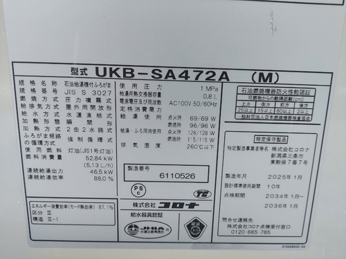 志賀町 コロナ給湯器→コロナ石油給湯機付ふろがまUKB-SA472A(M) 給湯器交換工事