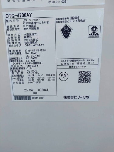 珠洲市飯田町 ノーリツ給湯器→ノーリツ石油給湯機付ふろがまOTQ-4706AY 給湯器交換工事